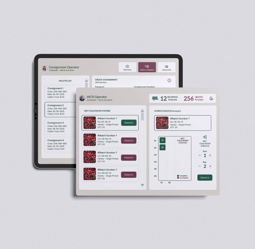 The challenge was to design an internal system that allowed workers to quickly log data with minimal friction, while ensuring accuracy, consistency, and full traceability from farm to consignment.