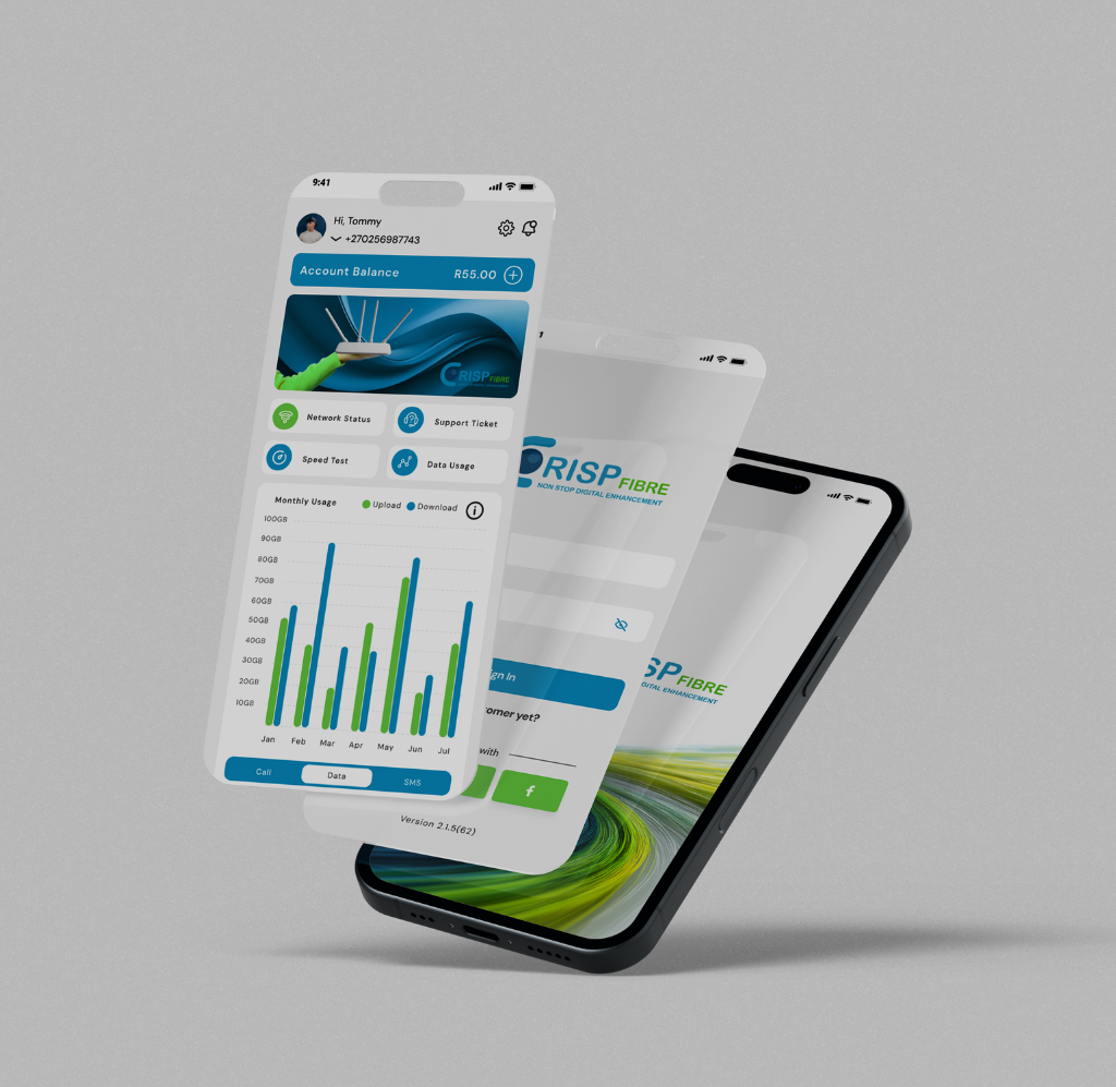 Crisp Fibre is a client self-management mobile app designed for Internet Service Providers (ISPs). Built for Future AXS, the platform gives customers easy access to their internet products, subscriptions, and account information — all in one streamlined interface. The app serves as a scalable solution that can be adapted across multiple ISPs, simplifying how users manage their connectivity services.